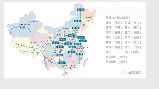 (圖片為首批16個(gè)海綿城市試點(diǎn)城市分布狀況(來(lái)源:網(wǎng)絡(luò)))